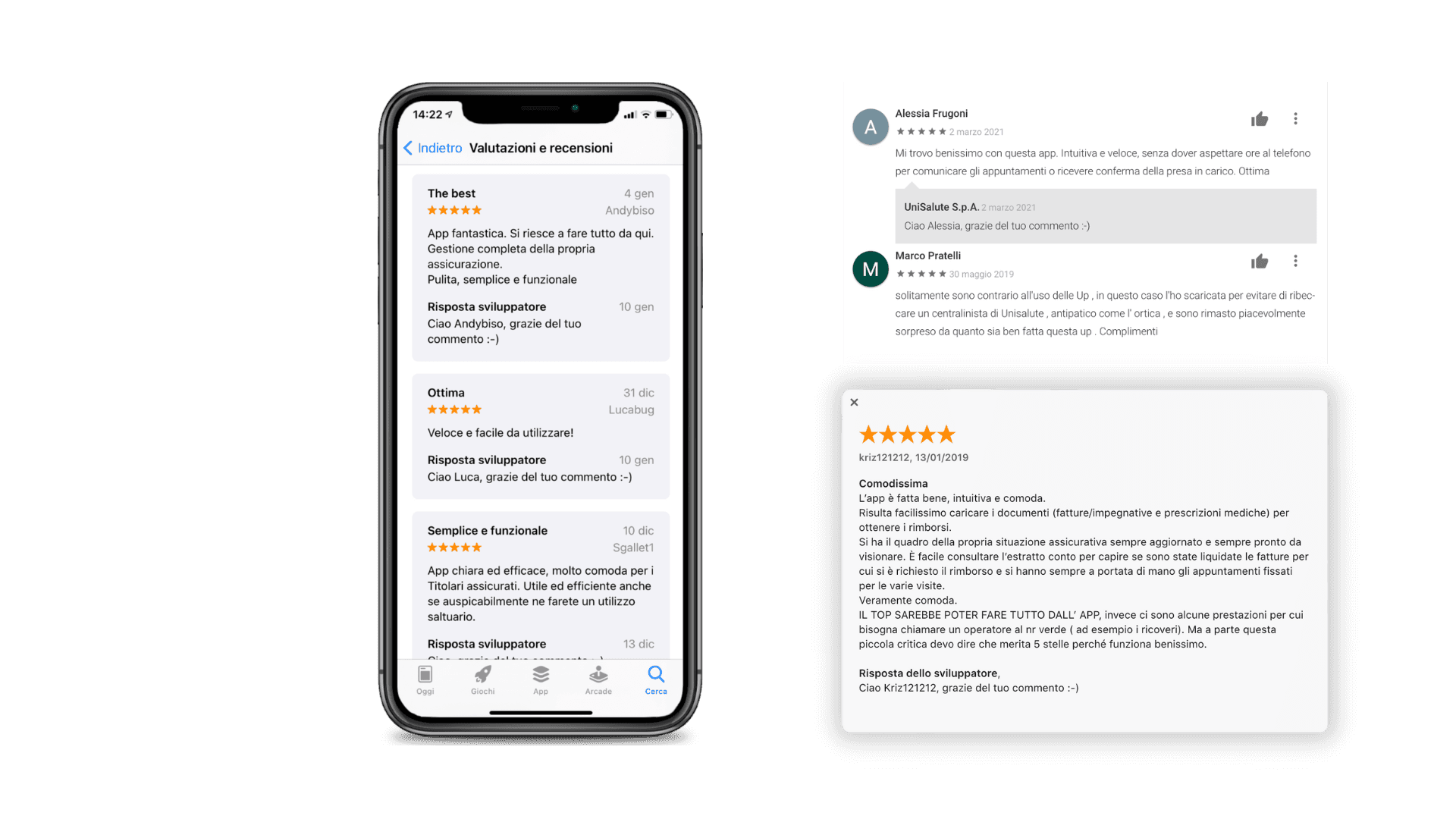 UniSalute Up has consistently achieved excellent ratings on app stores for over four years. With an impressive average rating of 4.5 based on more than 13,000 reviews on Google Playstore and 4.3 on the Apple App Store, UniSalute Up has become a benchmark for enhancing reservation processes across various apps within the Unipol Group. Additionally, the implementation of UniSalute Up has led to a remarkable 30% reduction in inbound calls.